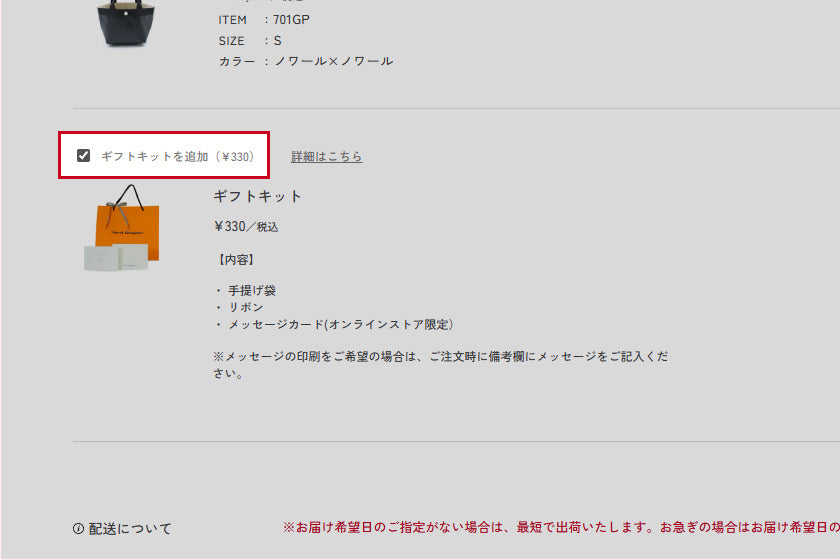 - 1注文につき、ギフトキットは1セットとなります。個別のギフトをご希望の場合は、別々にご注文下さい。