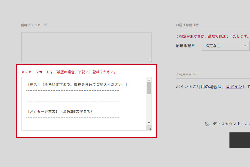 メッセージカードへの印刷をご希望の方は、ご購入手続き画面の「備考欄」にメッセージをご記入ください。